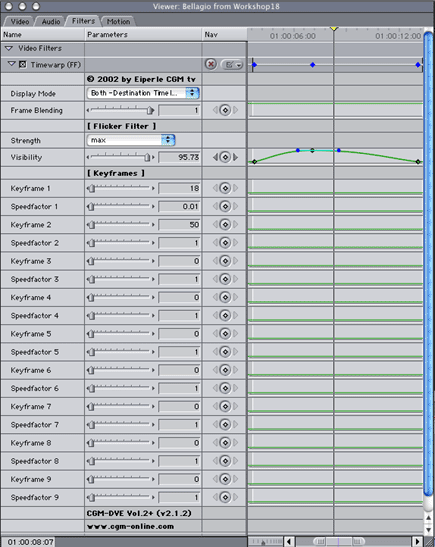 Hints: If you want to slow down interlaced video (like in our example), you`ll get normally a unwanted flickering. Therefore you should use the full-frame version: The TimeWarp (FF) and enable the Flicker-Filter with setting to max. Animate the visibility slider. If the speed is decreased, the visibility should be higher and if speed increases, the visibility should be lower. Sometimes it`s useful to turn off the Frame Blending while the speed is lower than 1. |