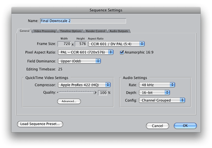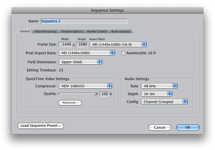 Wie konvertiert man Final Cut Pro HD Videos für eine Standard DVD in bester Qualität? Sie produzieren den Film in HD auf Final Cut Pro. Dann kopieren Sie alle Szenen aus der HD Timeline in eine SD Timeline und skalieren somit das Video in Final Cut Pro herunter. Exportieren Sie das Video als QuickTime Video und verwenden wie immer den Compressor für die MPEG2 Kodierung und dann DVD Studio Pro zur Erstellung der DVD. Natürlich können Sie auch das Video im Compressor herunterskalieren lassen. Nur ist dann das Video recht unscharf und entspricht nicht ganz unseren Erwartungen. Und jetzt Schritt für Schritt: Schneiden Sie den Film in einer HD Timeline. Das Bildschirmfoto rechts zeigt die Standardeinstellungen eines HDV 1080i/50 Projekts. Sie können auch jeden anderen HD Codec verwenden - vorzugsweise den Codec, in dem auch gedreht wurde. Für umfangreiche Farbkorrekturen macht es Sinn, HDV Material in Apple ProRes 422 (HQ) HD zu schneiden, da die Farbauflösung von HDV nicht sonderlich hoch ist. |