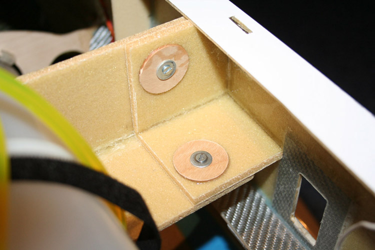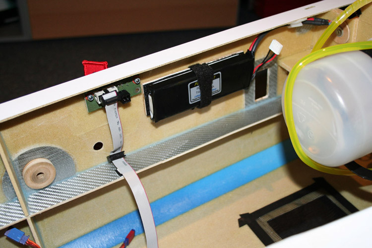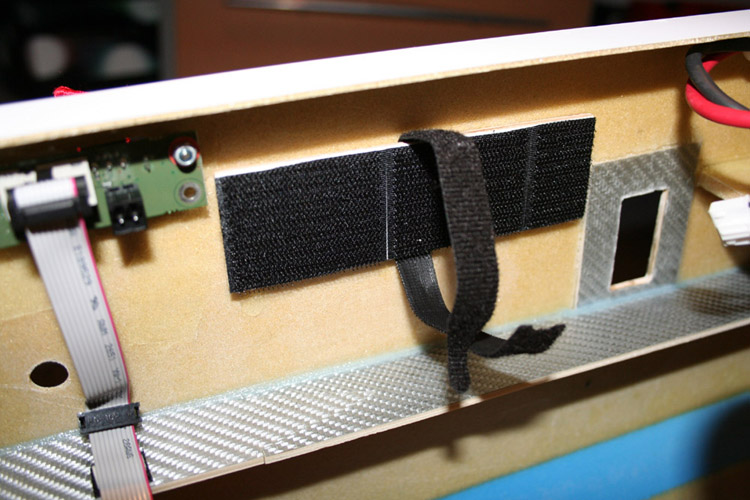 Die Akkuhalterung auf schwingungsgedämpftem Klettband und zwei dünnen Sperrholzschichten. Im Bereich der Klettbandschlaufe ist die zweite Sperrholzschicht ausgespart, so dass die Halterung absolut plan an der Rumpfseitenwand aufliegt.