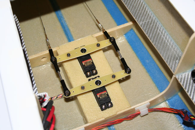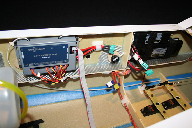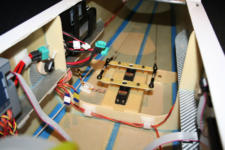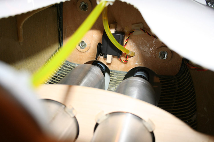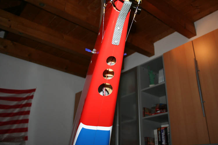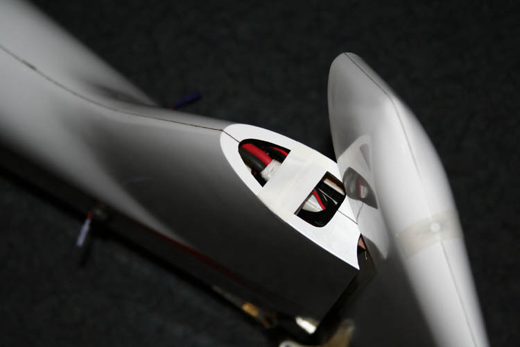 Im Laufe von über 230 Flügen habe ich verschiedene Umbaumaßnahmen durchgeführt. Um das Modell auch in der Hochachse besser auszuwiegen war Gewicht oberhalb der Motorachse notwendig. Deshalb habe ich die Empfängerakkus nach hinten in die Dämpfungsfläche des Seitenleitwerks verlegt. Gleichzeitig konnte ich damit den Schwerpunkt weiter nach hinten verlegen. Jetzt ist er 2,5 cm hinter der Hinterkante der Tragflächensteckung.
