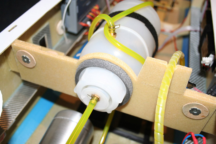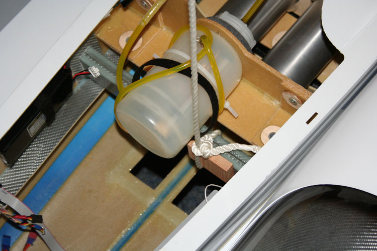 Die Tankhalterung lässt sich bei Bedarf demontieren. Sie belässt auch in montiertem Zustand genügend Freiraum an den vorderen Flächenschrauben und den Holmen. Da der Entlüftungsschlauch in allen Richtungen immer oberhalb des Tanks ist, kann er in keiner Situation auslaufen.