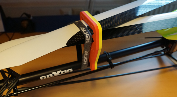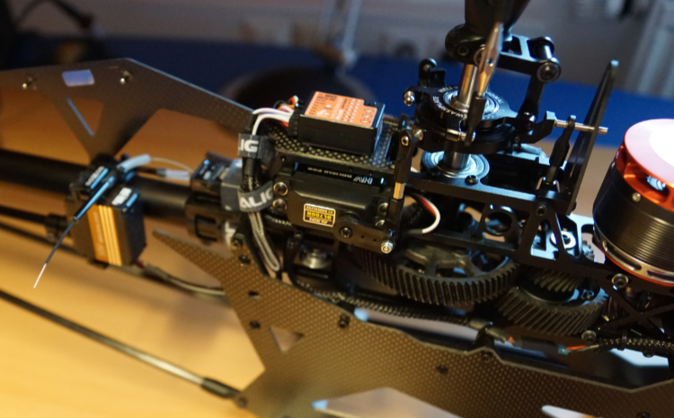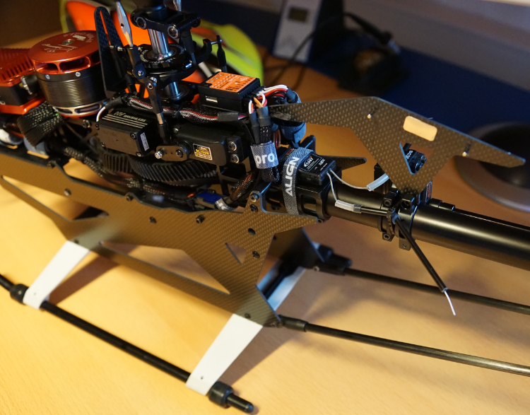 Damit die Heckrotorperformance auch bei härteren 3D Gangarten passt, verwende ich die 116 mm Heckrotorblätter. Die Neutralstellung hab ich auf etwa 5° eingestellt. Wenn man hinter dem Heli steht, drückt das Heck dann nach links.