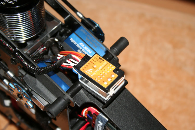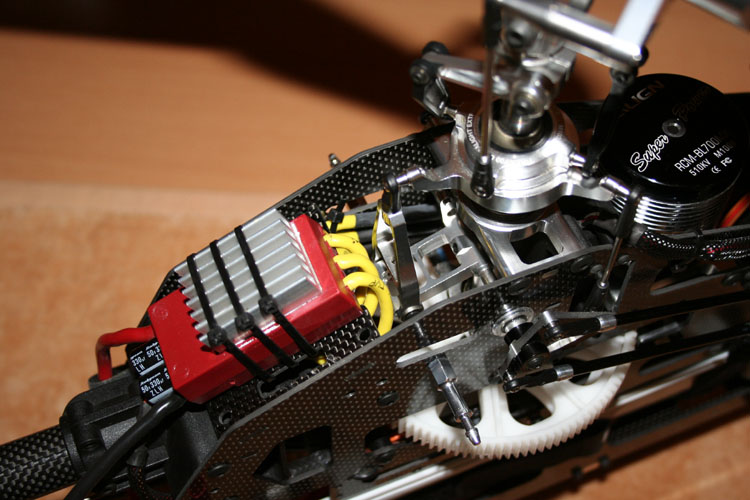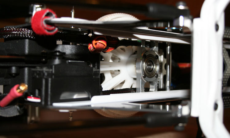 Mit dem dritten Domlager von KDE (KDE 700 Triple Bearing Block and Main Shaft Extension) wird die Festigkeit der kompletten Konstruktion deutlich verbessert... mehr ist nicht nötig. Die beiden Servokabel vom Regler (Master und Slave) habe ich auf der rechten Chassis-Innenseite verlegt. Das Servokabel zum Heckservo befindet sich auf der linken Seite.