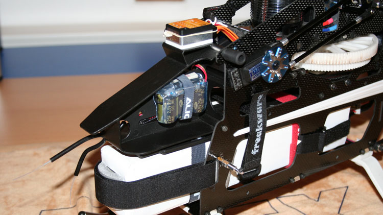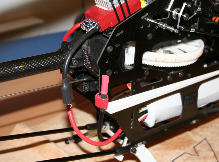 Die Akkukabel werden links und rechts am Chassis mit Klettbändern gehalten. Die Kabel dürfen die scharfen Carbonkanten nicht berühren. Die 6mm Goldkontaktstecker (keine Büschelstecker) behindern den Stromfluss nicht. An der Minus-Leitung des Reglers ist ein Anti-Blitz Widerstand (5 bis 6 Ohm Widerstand, 0.5 bis 1 Watt Leistung) angelötet. Beim Einstecken streife ich erst am Widerstand vorbei, bevor ich den Stecker zügig einstecke. Wenn man genau hinschaut, sieht man den 5mm dicken weißen Kunststoffstreifen unter dem hinteren Kufenbügel. Er sorgt dafür, dass der Heckrotor ca. 2,5 cm mehr Bodenfreiheit hat.