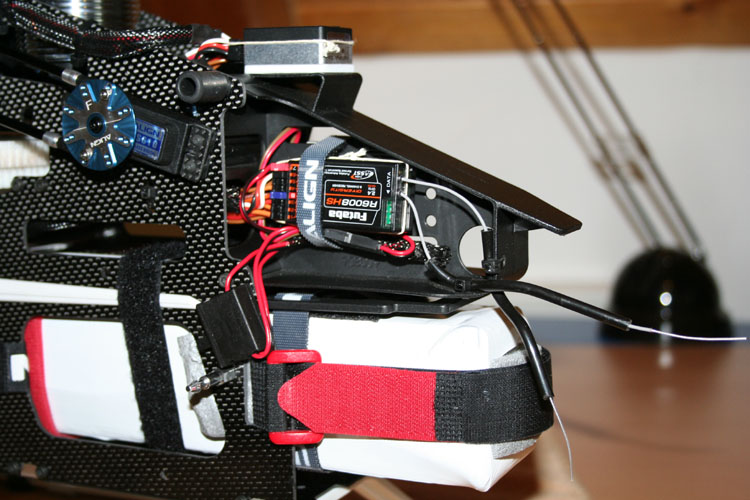 Auch am Empfänger habe ich die Kabel mit einer Schnur gesichert. Mit dem Ein-/Ausschalter wird der Elko-Akku vom Empfänger getrennt. Ansonsten würde der Regler beim nächsten Einschalten eine Unterspannungswarnung bringen. Die Empfangsantennen werden durch die Bowdenzugröhrchen zuverlässig in ihrer Position gehalten. Die Röhrchen habe ich an den Schnittkanten von innen entgratet. Die blanken Antennenteile sollten wo weit wie möglich vom Karbon Chassis entfernt sein und im 90° Winkel zueinander stehen. Damit der LiPo im Flug nicht hin und her schlägt, spanne ich links und rechts zwischen dem Akku und den Seitenplatten Schaumstoffstreifen ein. Der Akkuwechsel erfolgt immer mit montierter Haube.