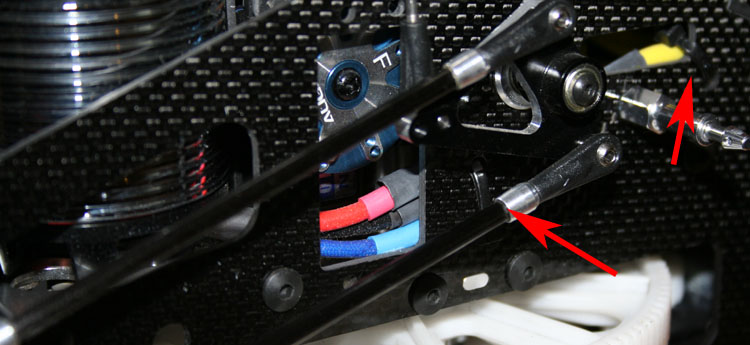 Die drei Kabel sind im Bereich des Nickservos übereinander angeordnet. So kommen sie dem Nickgestänge nicht in die Quere. Die Pfeile zeigen auf die beiden Kabelbinder.