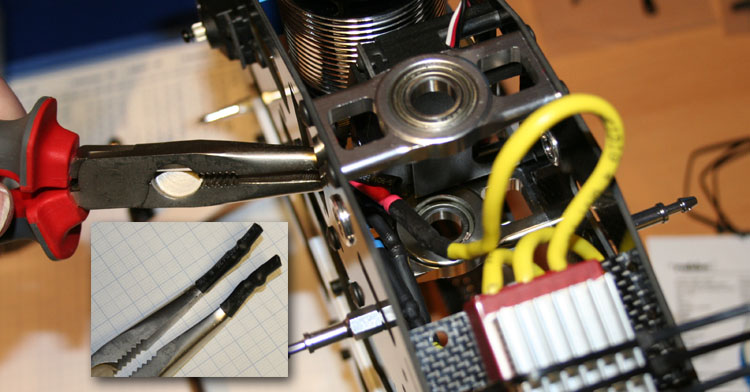 Das Anschließen der Motorkabel kann ganz schön knifflig sein. Um die Kabel dabei zu schützen, habe ich auf eine Spitzzange dicken Schrumpfschlauch gesteckt und wie im Bild zu sehen auf der Motorseite beim Zusammenstecken gehalten. Es ist wichtig, dass die empfindlichen Motorkabel nicht belastet oder allzu oft verbogen werden.